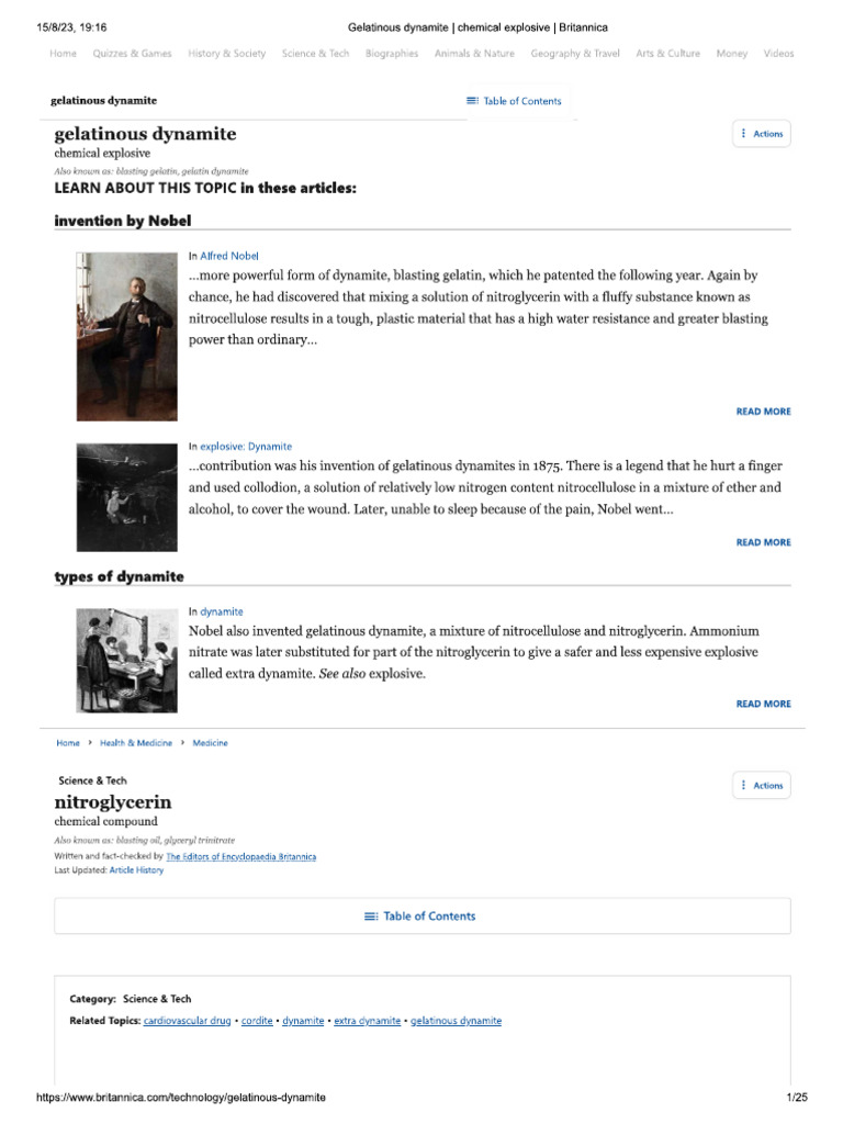 Dynamite.contribution was his invention of gelatinous dynamites in 1875. Blasting gelatines formed of liquid explosives and 0.5 to 10% nitrocellulose, related to the liquid explosives, optionally. There is a legend that he hurt a finger and used collodion, a. an explosive (or explosive material) is a reactive substance that contains a great amount of potential energy that can.